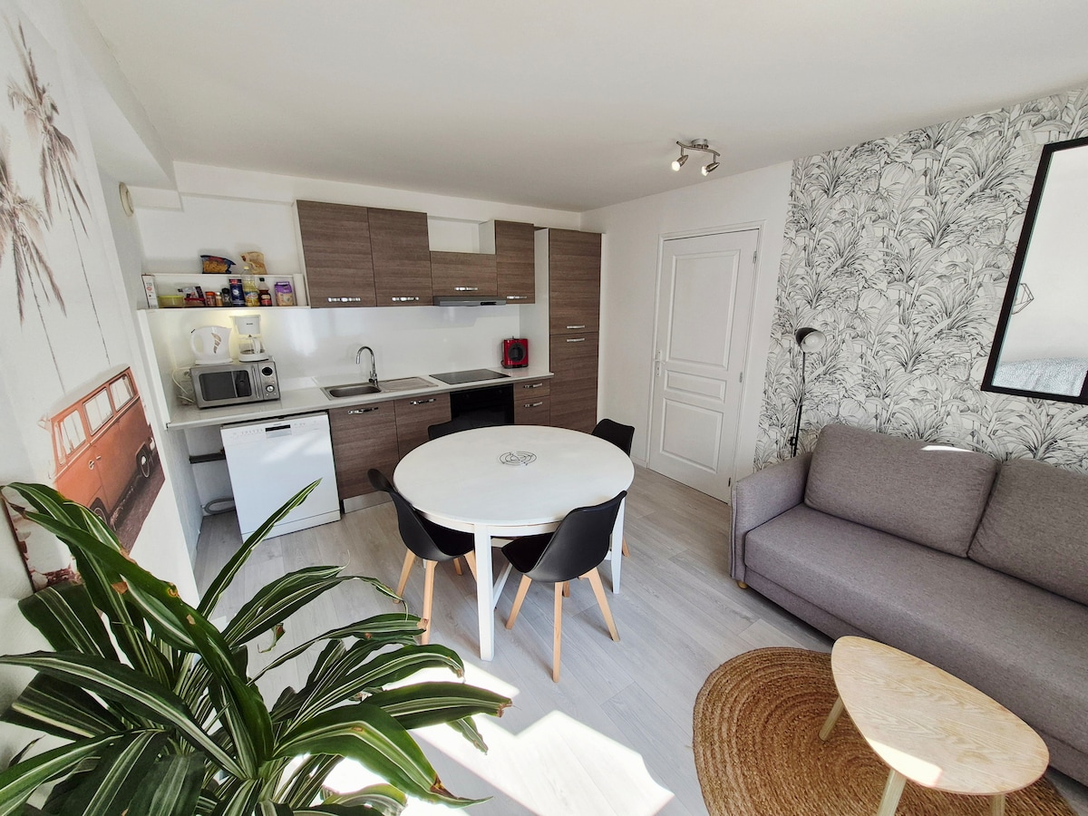 Enjoy your vacation in La Baule in our little cozy and bright apartment, on the seafront on Benoît beach. You will appreciate the comfort of being able to get around on foot. The residence is located near shops and restaurants, and two grains of sand from the ocean. The terrace offers you a haven of peace even in high season: overlooking the park and the palm trees, you will only hear the singing of the birds.