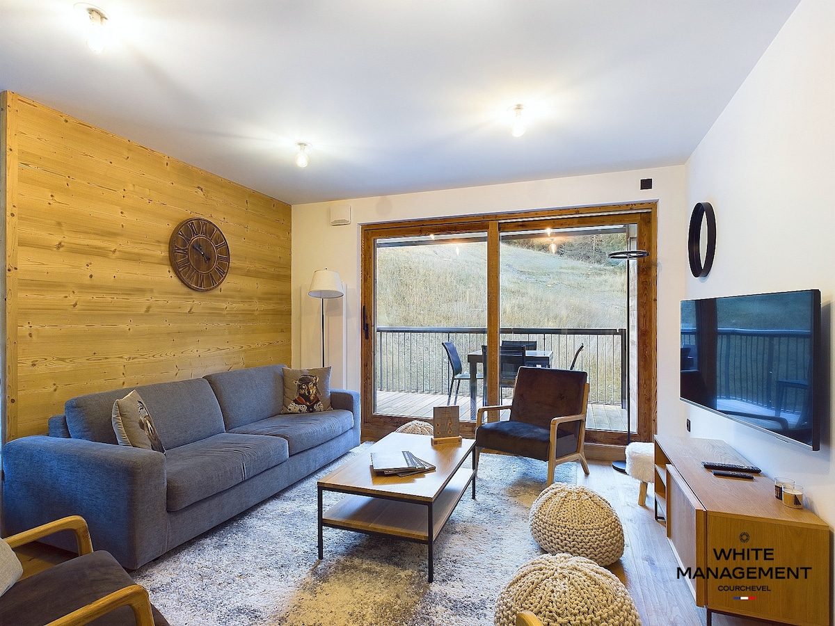 Appartement juste rénové Courchevel le Praz, pied des pistes. 4 à 6 pers. Salon salle à manger, balcon orienté sud-est vue village et montagne, 2 chambres : 1 suite avec salle de bain baignoire balnéothérapie, 1 salle douche multijets, parking privé. la place de parking dispose d'une borne de recharge pour voiture électrique.