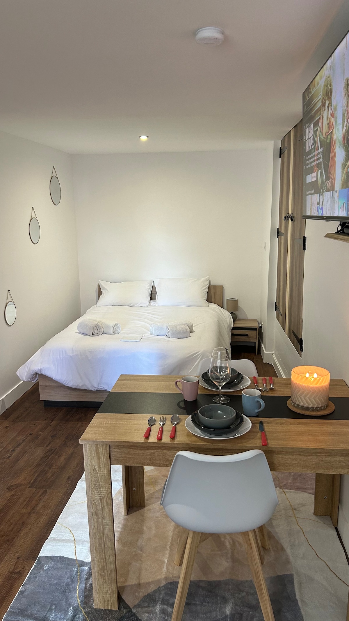 🪵Studio moderne refait à neuf, lumineux avec placards bois. 🛏️ Petit coin chambre cocooning avec grand lit confortable face à la TV (Netflix inclus). Literie douillette et de qualité. 🍳 Cuisine entièrement équipée : micro-ondes, cafetière, bouilloire, grille pain etc. 📍 Hyper centre, rue calme, tous commerces et monuments accessibles à pied. Parking proche ! Wi-Fi inclus 🔑 Arrivée autonome, boîte à clés, linge de lit fourni. Logement pratique et confortable pour voyageurs ou les pro.✨
