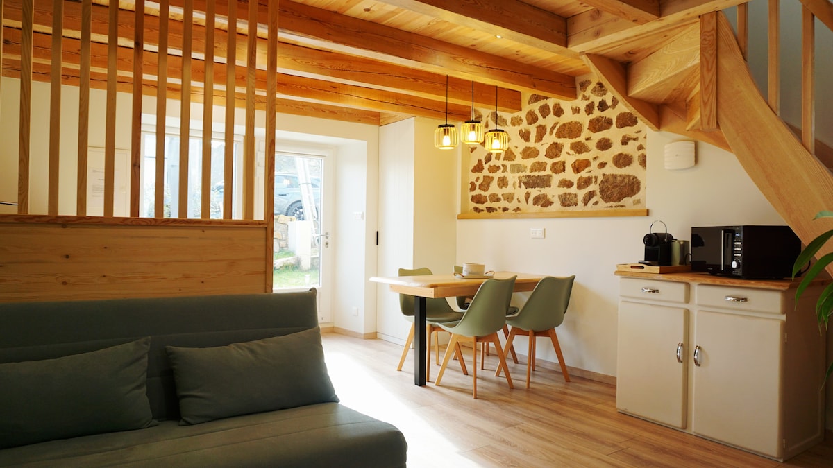 Besoin de déconnecter dans la nature, de confort douillet au coin du feu ? Cette ancienne petite chaumière en pierre et bois, rustique et cosy est faite pour vous ! Le bain nordique jacuzzi privatif et le sauna panoramique est à votre disposition tout au long de votre séjour. Avec sa cheminée, sa terrasse de lauzes, son calme : l'endroit idéal pour faire une vraie pause été comme hiver. Cocooning en amoureux, activités nature en forêt et sur les plateaux auvergnats ! Time to relax !