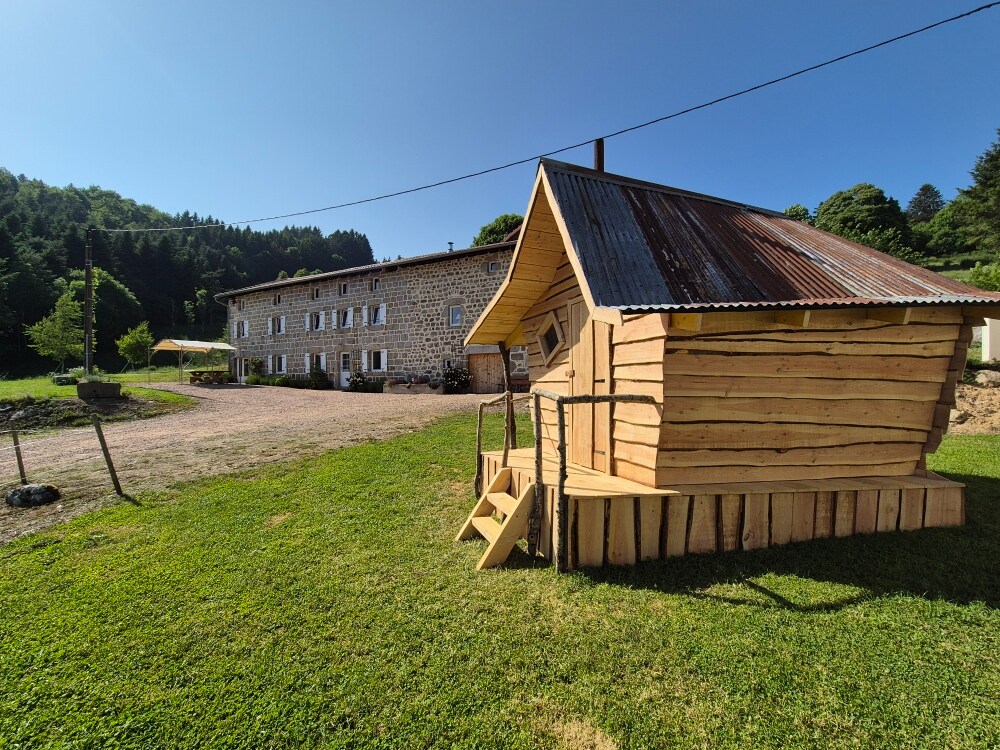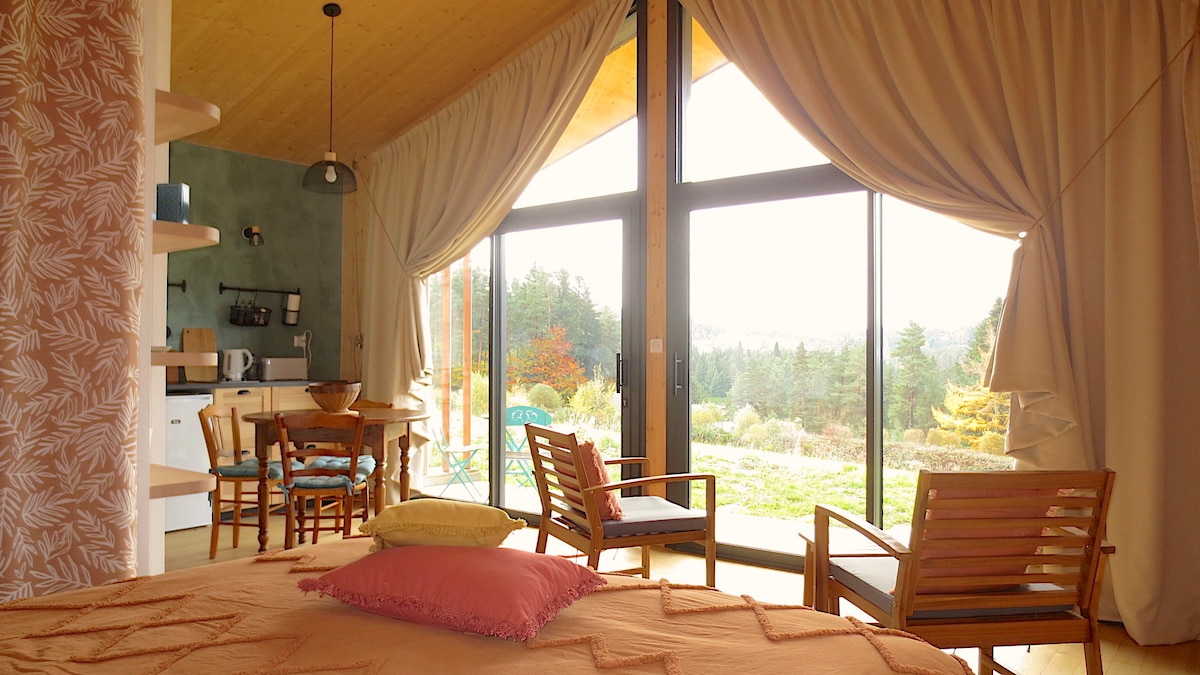 En lisière de forêt, Lodge pour duo, conçu avec des matériaux naturels pour un espace à vivre sain et lumineux. Literie en 160, cuisine, douche italienne. La façade entièrement vitrée s'ouvre par un lever de rideau sur la plaine et les collines boisées. Un accès sauna par séjour vous est offert (hors sècheresse estival), possibilités de massage énergétique aux huiles ou de soins esthétiques sur place. À partir de 3 nuits -10% et -15% pour une semaine. Peace & Lodges au Chambon sur Lignon !