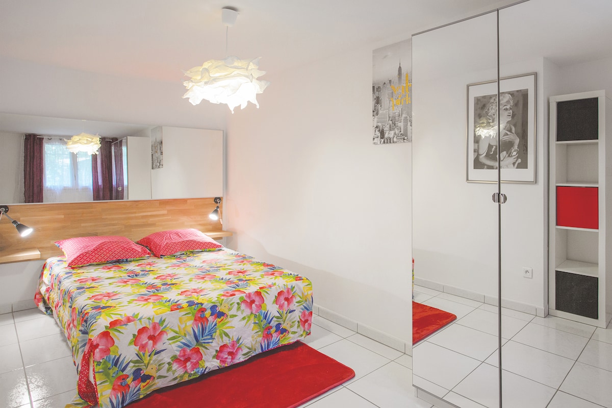A 10mn du centre ville,dans un cadre idyllique et au calme, Grand Appartement de 75m² , en Rez de Chaussée de Villa .Grande cuisine moderne et son coin repas, Vaste séjour- salon, ( avec un grand canapé convertible pour deux personnes ) . Belle chambre à coucher ( lit 1.60 x 1.90 ) avec dressing. WC indépendant. Salle d'eau (vasque et douche à l'Italienne). Terrasse ombragée pour petits déjeuners et repas à l'extérieur . Barbecue. Piscine à débordement et soleil ... Bienvenue. A bientôt.