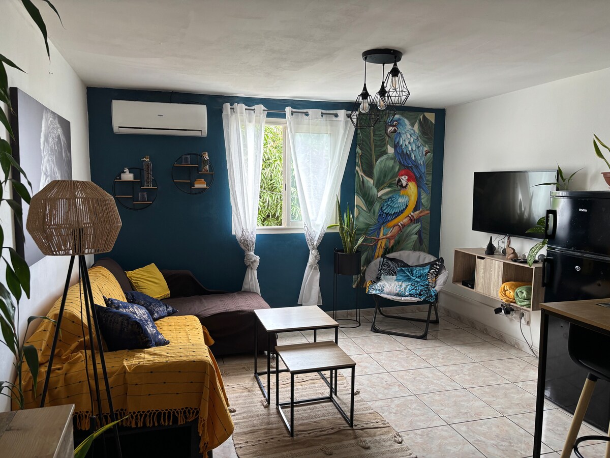 Studio cosy ⭐️⭐️⭐️ à la Petite Île : vue imprenable, piscine sur le toit et plage à 10 min !🌊🏖️ Vous rêvez d'un coin de paradis au cœur du sud de l'île ? Ce studio tout équipé, situé à la Petite Île, vous offre le meilleur des deux mondes : le calme d'un village et la proximité du Sud Situé à l'étage de notre Villa en fond d'impasse sans vis à vis avec terrasse vue mer 🌴 Ce que vous allez adorer : * La piscine en rooftop * Plage de Grand Anse à 10 min * La nature et le calme * Le studio équipé