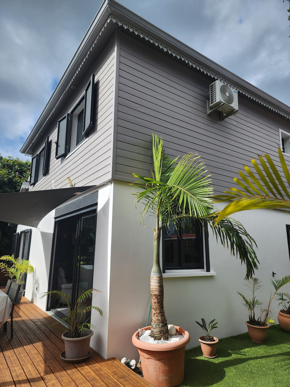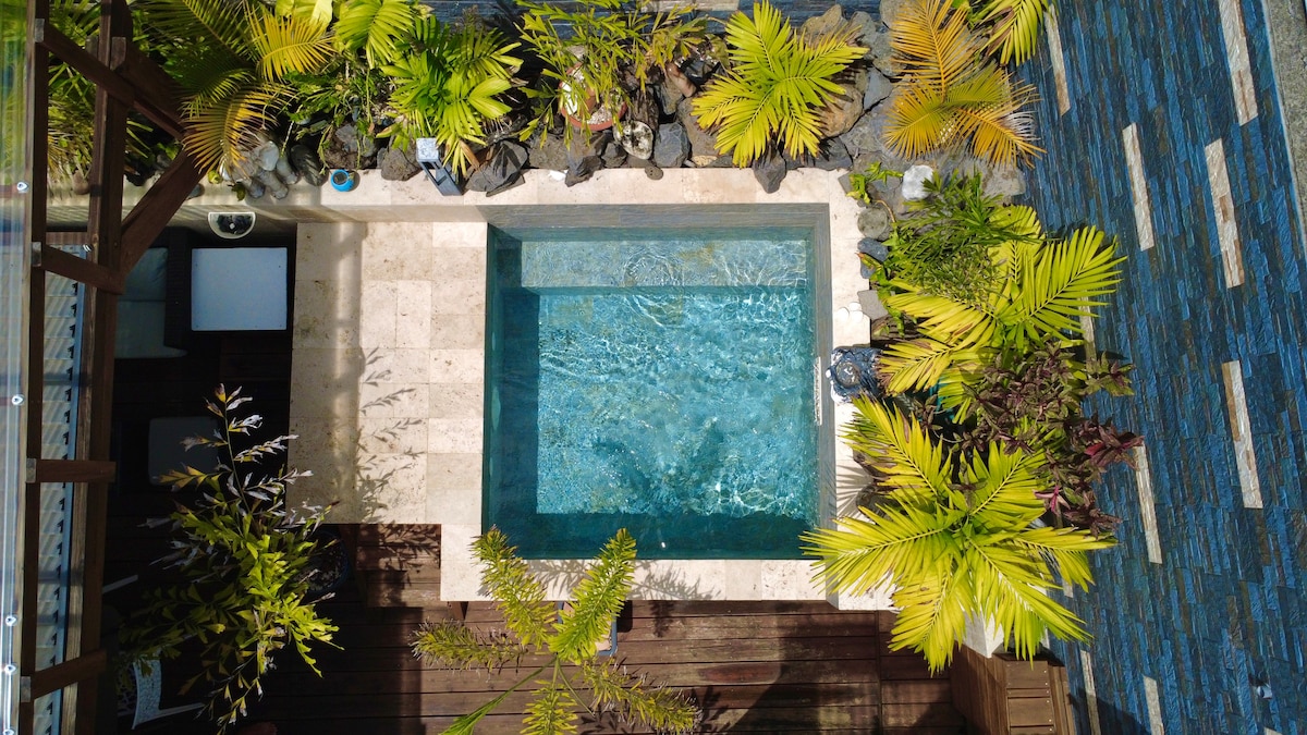 Villa moderne tout équipé avec jacuzzi/mini-piscine de 2,70mx2,70m , 2 chambres avec lit King-size 160x200 dont une sur-mesure équipé de climatisation, armoire de rangement et télévision. Salle de bain confort avec douche à l'italienne, WC moderne. Salon équipé de fauteuil, télévision et table de repas. situé dans un endroit calme, à 10 minute de saint pierre et de la plage avec jacuzzi privatif uniquement pour votre logement, parking.