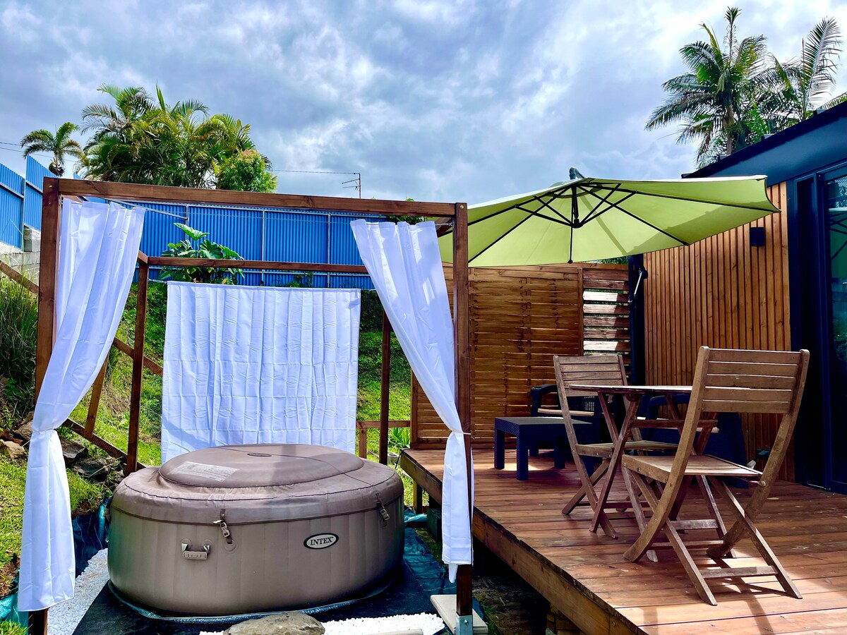 Villa moderne tout équipé avec jacuzzi/mini-piscine de 2,70mx2,70m , 2 chambres avec lit King-size 160x200 dont une sur-mesure équipé de climatisation, armoire de rangement et télévision. Salle de bain confort avec douche à l'italienne, WC moderne. Salon équipé de fauteuil, télévision et table de repas. situé dans un endroit calme, à 10 minute de saint pierre et de la plage avec jacuzzi privatif uniquement pour votre logement, parking.