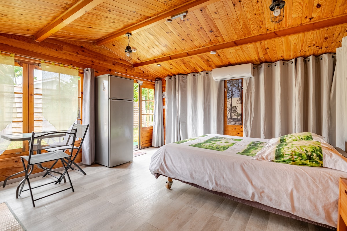 Un week-end ou de longues vacances en amoureux ou avec un enfant ? Venez vous ressourcer dans notre agréable chalet en bois. Passez de bonnes nuits au cœur d’un environnement calme dans une literie de qualité en 160 cm. Nous serons heureux de vous accueillir sur notre propriété dans un chalet indépendant type studio de 25 m2 tout équipé en avril 2019, sans vis à vis avec un jardinet clôturé. Selon vos envies, vous pourrez profiter de l’extérieur pour vous détendre, fumer ou vous restaurer.