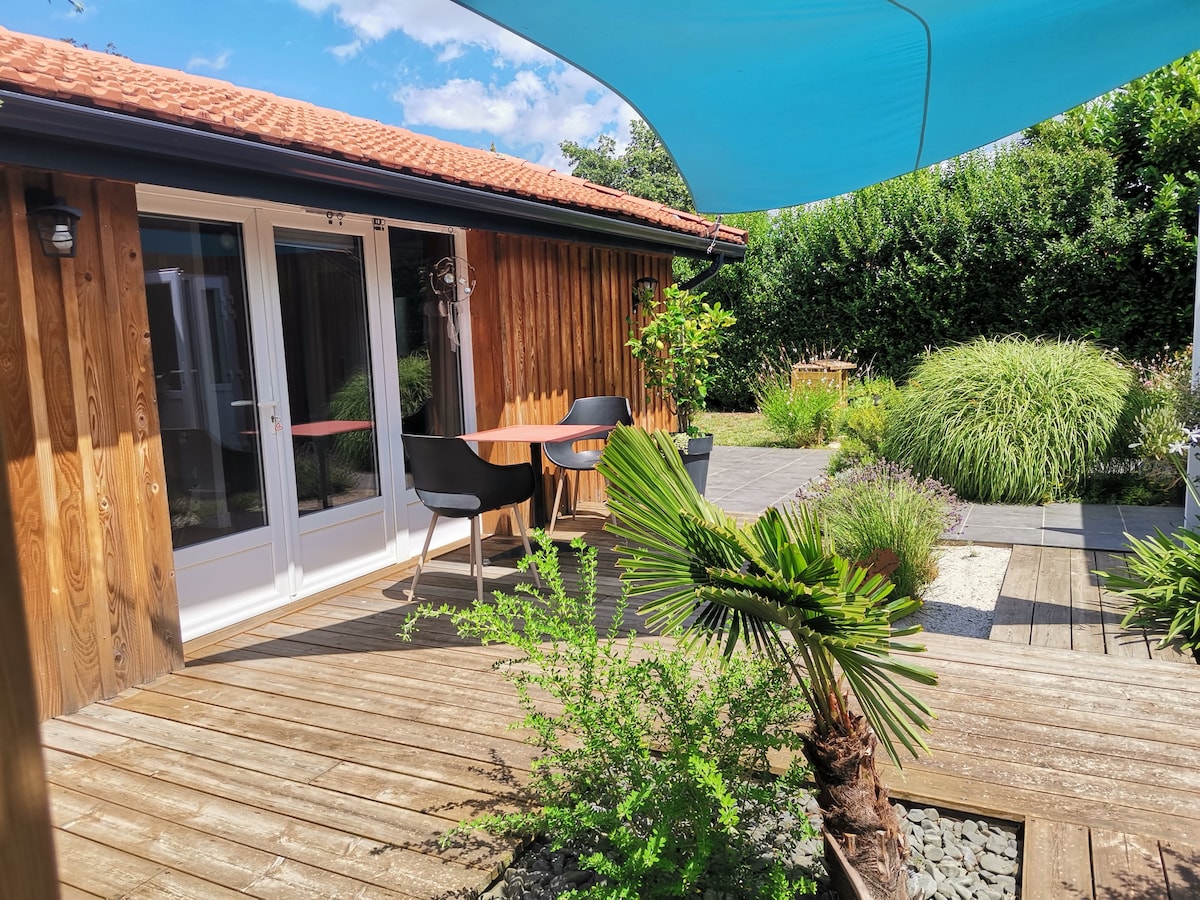 Logement pour 2 personnes de 40 m2 à proximité du centre ville et de toutes commodités et à 4 kilomètres d'Arcachon. Cuisine entièrement équipée - wc indépendant - une chambre avec rangements - lit 140 - salle d’eau avec douche et grande vasque - jardin - plancha. Votre véhicule sera en sécurité, une place de parking à votre disposition dans le jardin. (Ce logement ne convient pas aux bébés, aux enfants ainsi qu’aux animaux). Le jacuzzi sera installé à partir du 6 juin 2026.
