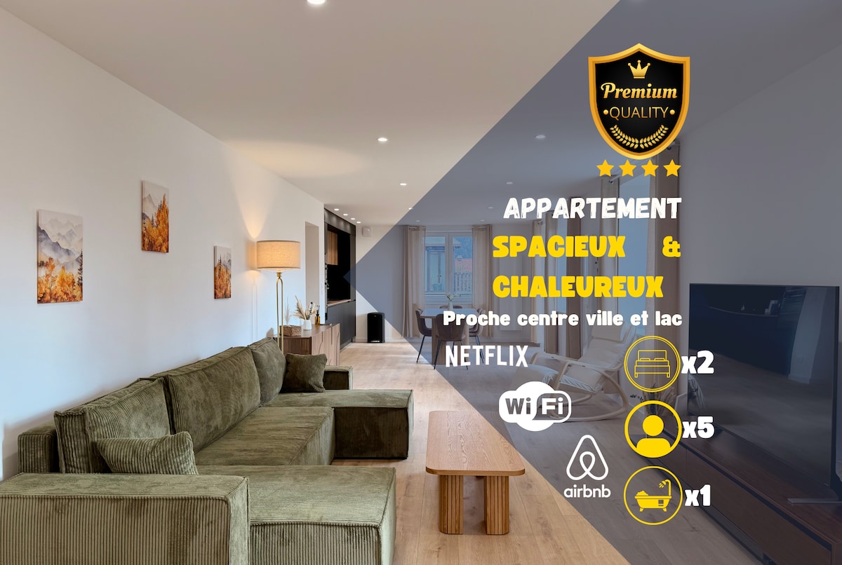 Magnifique logement avec terrasse en bois. Très lumineux, plein centre à deux pas de tous commerces et de toutes activités. Magnifique logement mansardé avec terrasse dominante en bois. Equipé d’un canapé convertible 2 places, cuisine équipée, lave-linge, sèche-linge, four micro-ondes, etc... Salle de bains avec douche spacieuse. Parking gratuit, box à skis et vélos. Et BEAUCOUP, BEAUCOUP, BEAUCOUP, d'autres choses..... Animaux de petite taille admis (entente préalable): GRATUIT