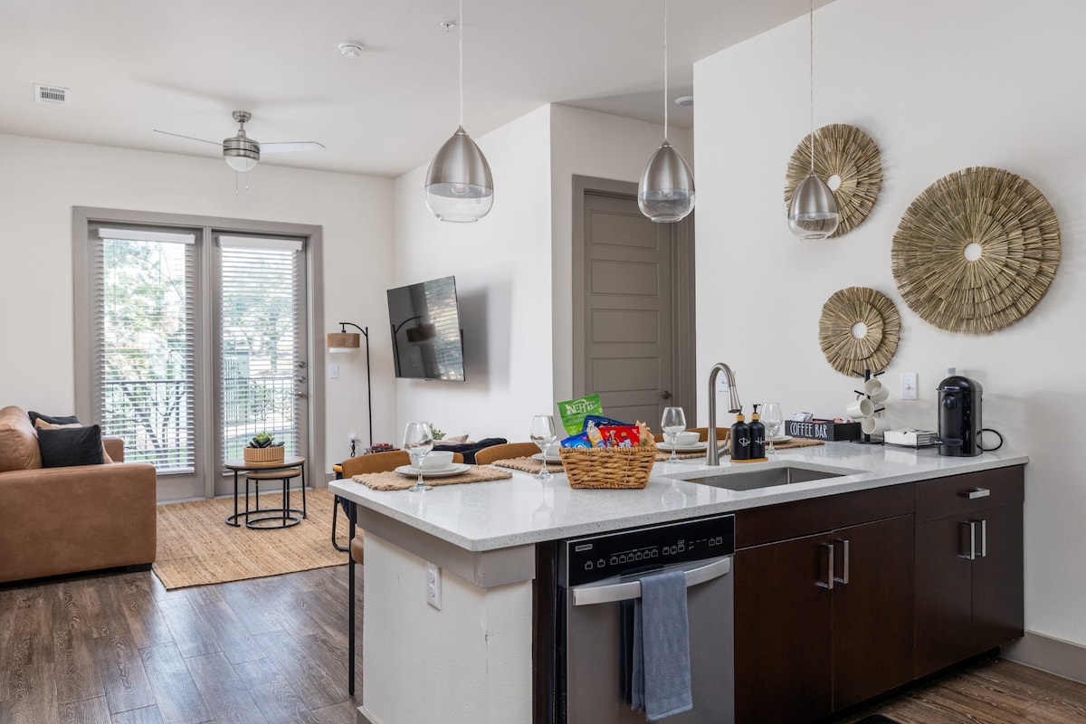 Unwind in this relaxing townhouse overlooking the 4th green in a scenic Lake Travis community. Enjoy two decks with sunset and hill country views, deer at dusk, and access to a lakefront park, pool, gym, and pickleball courts. King bed in master, fully stocked kitchen, nearby grocery and floating restaurant. Just 45 minutes from downtown Austin—your peaceful getaway close to everything Austin offers.