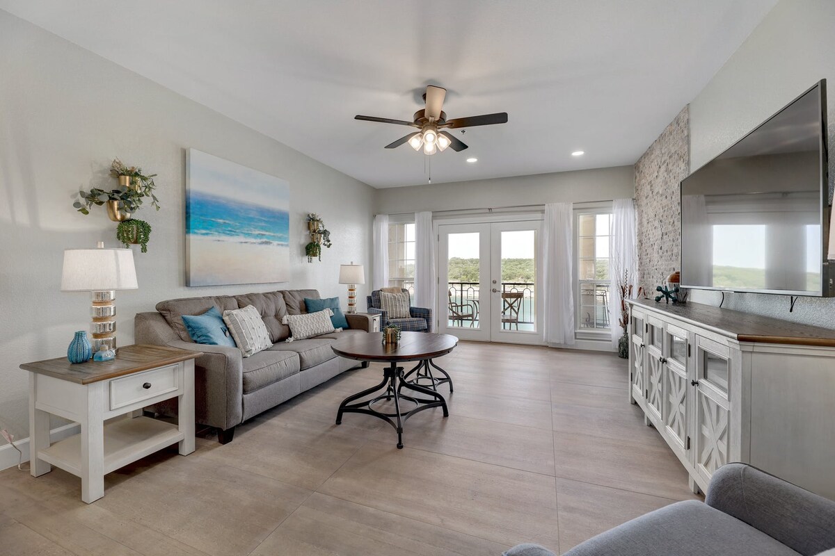 Waterfront top floor villa with deep water views from large patio, living room and bedroom. Daily deer encounters. Watch sunsets on Lake Travis' private island. Stand up shower, jacuzzi tub, washer/dryer, weekend salon/spa, restaurant, 3 pools (indoor is closed) , hot tubs, saunas, elevator access, fitness center, shuffleboard, WiFi, pickleball and tennis. Max 4 guests, including infants and children. 21+ to book. More villas available for family. Nice people only! 😊