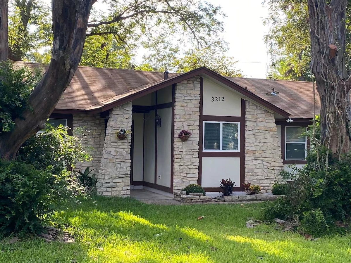 Welcome to your peaceful and private studio apartment. This Austin themed retreat features a comfortable Queen-size bed, twin pull-out sofa, small kitchenette, keurig coffee maker, mini fridge, and convenient portable convection cooktop; walk-in shower and a front porch as well. Enjoy the private entrance and separate side yard area, ideal for pets and relaxing in this calm and quiet space. Please note there is no separate bedroom, ideal for the 1-2 people-3 max. Extra fee more than 3 guests.