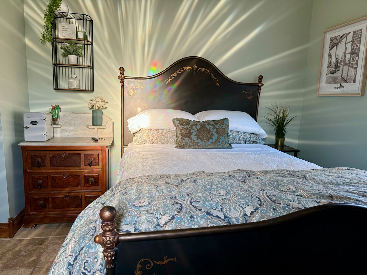 We are operating a family ran bed and breakfast within our home in Weston, Mo. Our Garden Suite is a charming mint room, where modern and garden vibes meet. This suite features a queen sized bed and its own private bathroom. It also has its own entrance/exit, that is met by an outdoor seating area. The outdoor seating area has patio furniture and lights at night, and is extremely peaceful. The room also features a small smart tv, and of course Wi-Fi.