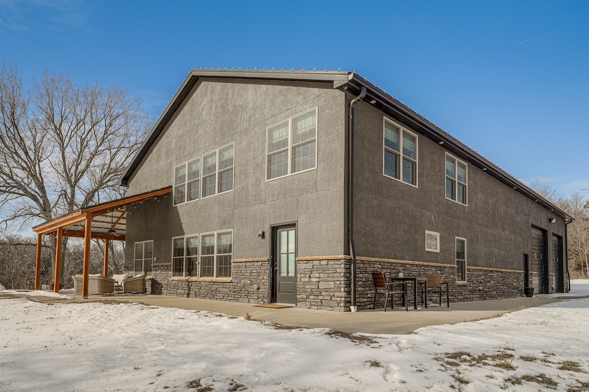 Wrap yourself in nature and luxury in the enchanted hills of Tonganoxie, overlooking Nine-Mile Creek Valley. This forested designer sanctuary features 3,500 sqft - 3 bedrooms and 3 bathrooms on 10 secluded acres. Dive into the mystical waters of a natural swimming pool, sleep in regal king beds with the finest linens. Relax in three spacious living rooms. The kitchen, fit for a culinary wizard, awaits your gourmet creations. This land has healing properties - ground out, reconnect, recharge.