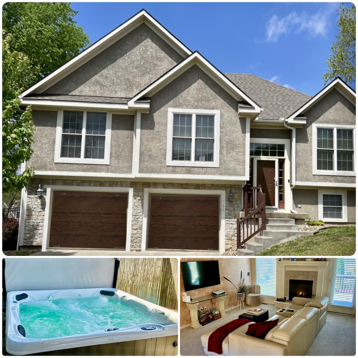 Spacious three-level retreat in the Village West Entertainment District, minutes from Legends Outlets, Kansas Speedway, Sporting KC, golf, restaurants, and shopping. Sleeps up to 14 guests with 4 bedrooms, loft sleeping area, and 4 full baths with bidets. Enjoy a sport court for pickleball/basketball, swim spa, gym, arcade, pool table, ping pong, darts, shuffleboard, mini golf, and more. Overlooks Sunflower Hills Golf Course.