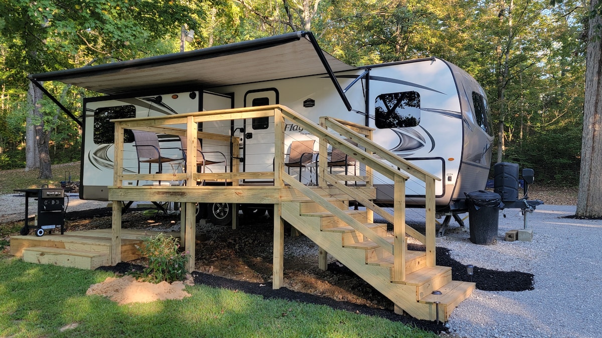 Our non-electric cabin in the woods is the perfect glamping opportunity. This rustic retreat is a 5-8 minute walk from our house and parking lot. The 270 square foot tiny house has a queen mattress in the loft, a wood stove for heat, cooking facilities including a propane cook top and gravity fed rain water (non-potable). Large windows look out over a beautiful southern Indiana holler. Camp shower & composting toilet. Experience comfortable, tent - free camping!