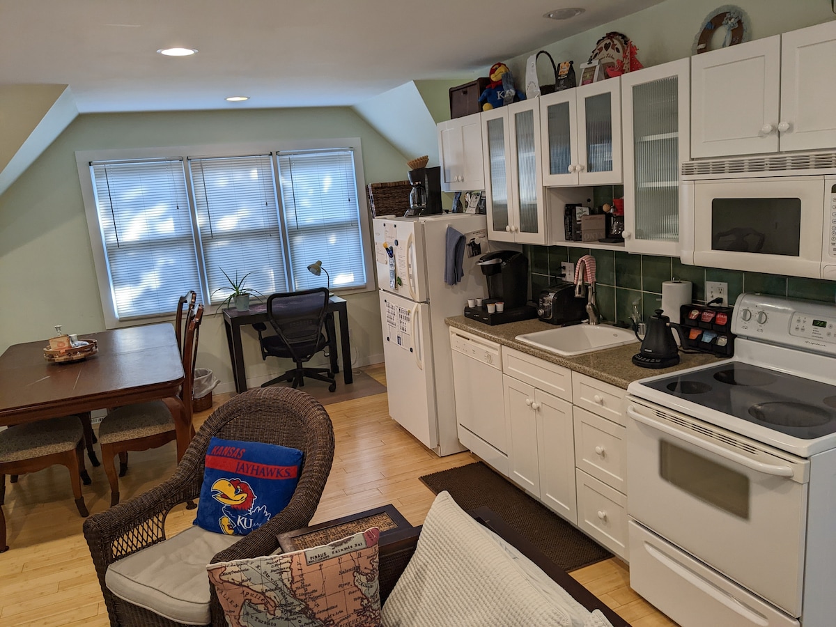 Stay downtown near restaurants, coffee shops, shopping, and shows. Only a few blocks from the Granada and Library. Just 1 mile to the KU campus and 2 miles to I-70. The guesthouse has a tile entry with one flight of carpeted stairs. The kitchen has white cabinetry with Silestone countertops, a microwave, range, dishwasher, and refrigerator. The laundry area has a washer, dryer, and a tankless water heater. The bath has a white vanity with Silestone counter, and sun tunnel.