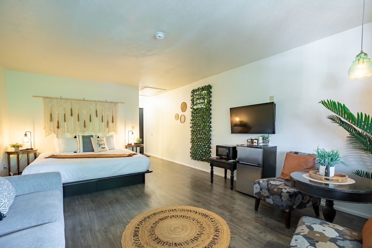 The is a boutique accommodation with individual private suites/rooms that are self service. Self check-in/check-out with your own private outdoor entrance. Includes: Queen bed, Mini Fridge, Keurig w/coffee, Smart TV, Door keypads & all new linens, furniture & fixtures. $25 FEE per PET - Undisclosed pets charged $250.00 PARKING Your ONE parking space is in the main parking lot. There is a $25.00 fee for additional Vehicles