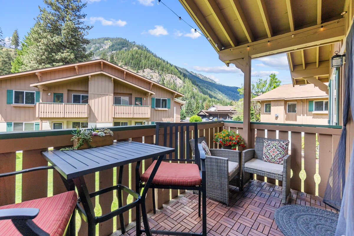 Cozy condo set in the pines, an ideal location just a short 15 min walk from downtown Leavenworth! Sleeps 4 people comfortably, 2 bedrooms with queen size beds, 2 bathrooms. Comfortable living area with 55" smart TV, gas fireplace and games to enjoy. A fully stocked kitchen with pots/pans and ingredients for all your cooking and baking needs, complete with washer/dryer, and a deck with mountain views! *fireplace is seasonal and only operational during fall and winter months.