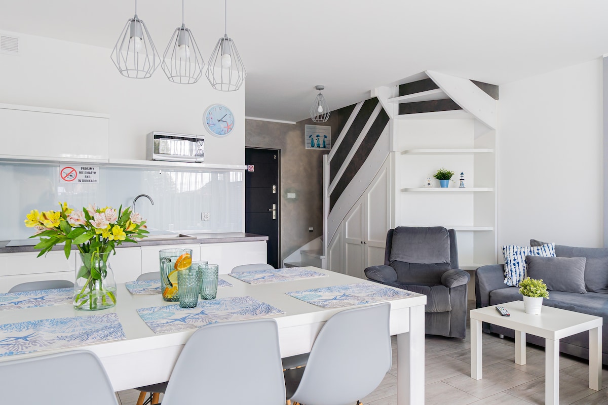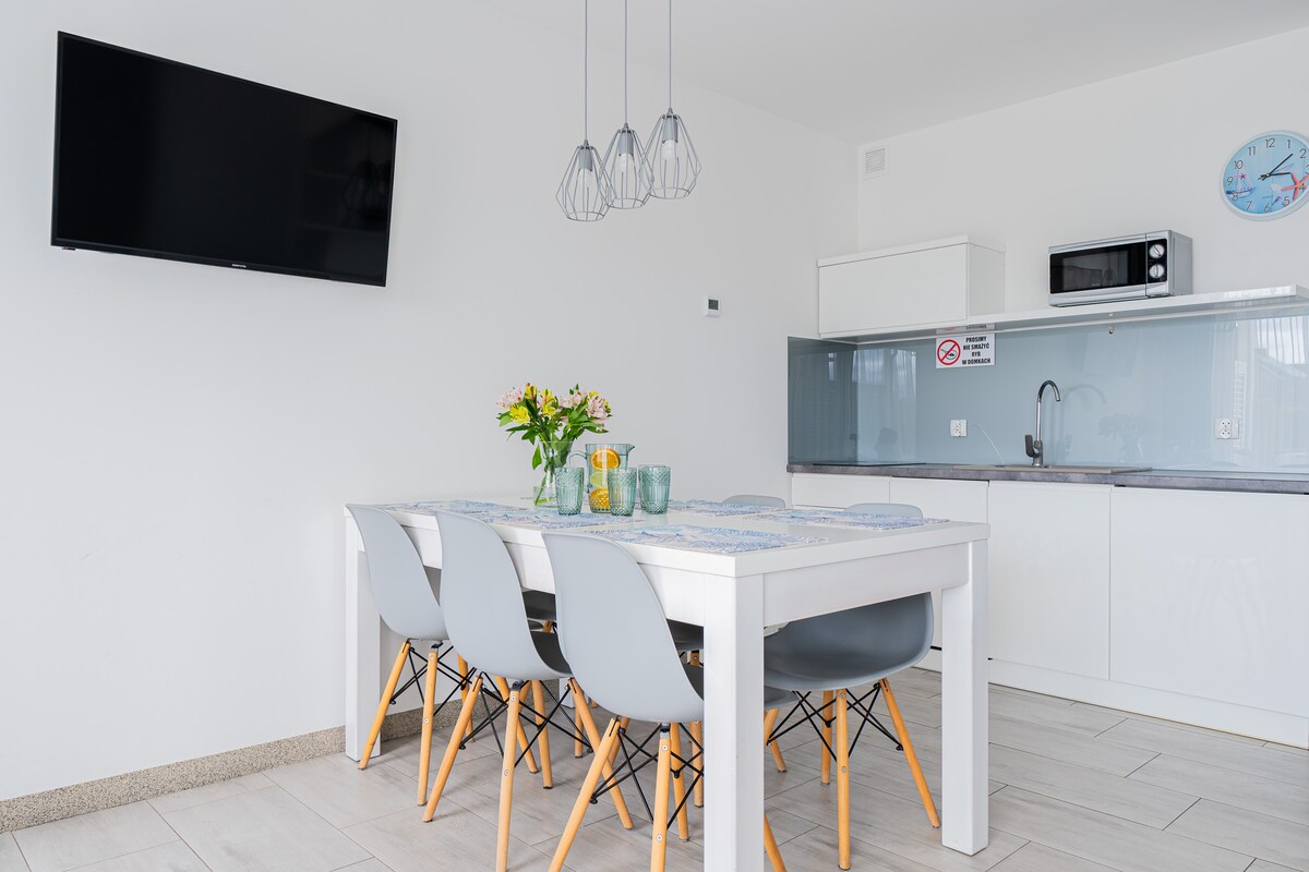 Apartament na wyłączność obejmujący połowę domu w zabudowie bliźniaczej znajdujący się w spokojnej i cichej okolicy w miejscowości Świecino. Działka powierzchni 2000m, ogrodzona, otoczona lasem i cała do dyspozycji gości Apartament 8 osobowy. Na piętrze 2 sypialnie oraz łazienka. Na parterze salon z rozkładaną kanapą narożną. Aneks kuchenny oraz druga łazienka. TV, Internet Wi-fi.