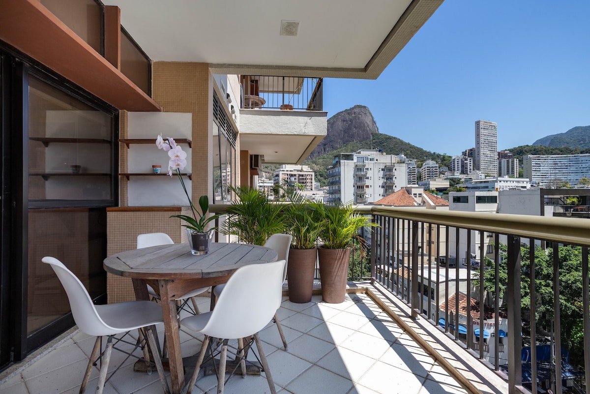 Enjoy a stunning and unique view of both the ocean and the mountain in a centrally located 2 bedroom renovated apartment in Leme, Copacabana ideal for families and couples. The apartment is cozy and has everything you need to make you feel at home. A very spacious and stylishly decorated living room, and a fully equipped apartment. One bedroom has a queen bed, the second bedroom has 2 single beds, and there are 2 more mattress/futons that can be placed in the living room if needed.