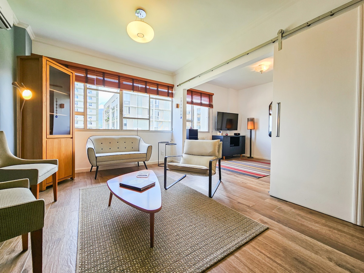 Enjoy a stunning and unique view of both the ocean and the mountain in a centrally located 2 bedroom renovated apartment in Leme, Copacabana ideal for families and couples. The apartment is cozy and has everything you need to make you feel at home. A very spacious and stylishly decorated living room, and a fully equipped apartment. One bedroom has a queen bed, the second bedroom has 2 single beds, and there are 2 more mattress/futons that can be placed in the living room if needed.