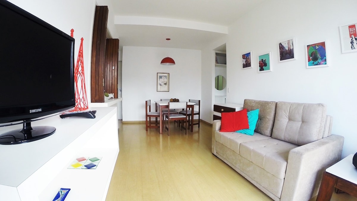 Spacious aparthotel, with living room, 1 bedroom, kitchen, complete bathroom, bed and sofa for 4 people. Bright, quiet, with balcony and Split air conditioners. Garage, sauna, swimming pool, maid service, 24h/7d concierge. Close to the subway, restaurants, theaters, gyms, shopping malls and Leblon beach. Discounts already included: 1 week: 15% 1 month: 30%. To learn more, contact us. We'd love to answer your questions :)