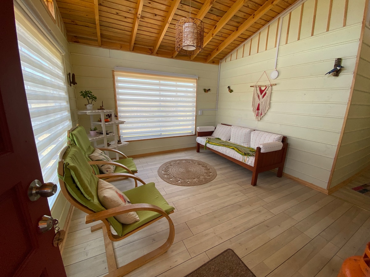 Cabaña acogedora ubicada en medio de bosque nativo en Arauco, ideal para parejas o viajeros que buscan descanso, silencio y conexión con la naturaleza. Cuenta con estufa a leña, terraza con parrilla, cocina equipada y conexión Wi-Fi Starlink, apta para trabajar a distancia. Entorno tranquilo y privado, con senderos y rutas escénicas al interior del campo.