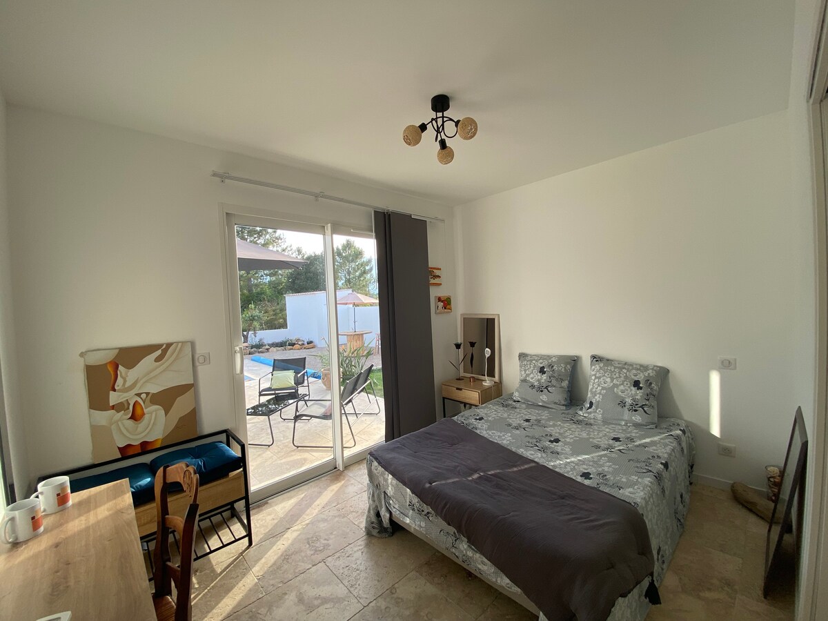 Chambre indépendante vue piscine, faisant partie d’un jardin paysager d’essences locales. La chambre de 16m2 est équipée de salle de douche et de WC privés, lit (160), penderie, cafetière, bouilloire, rideaux occulants. Nous habitons sur place et partageons le jardin, les terrasses, la petite piscine, au calme, mais à 2km du centre. Petits déjeuners bio servis quand la météo le permet, préparation d’un encas froids possible. Pas de télévision, pour un vrai repos.