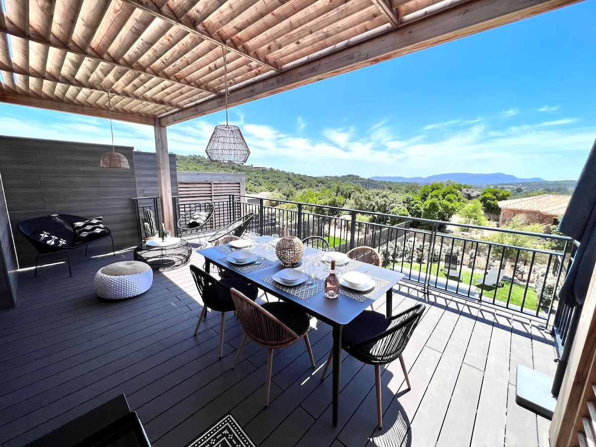 La villa Prisuccia est située au calme, au cœur du hameau de Porto-Vecchiaccio, à 15 minutes en voiture de Porto-Vecchio et à 5 minutes de la très belle plage de St Cyprien ; le terrain est entièrement clos et offre une vue panoramique mer & montagne, sans aucun vis-à-vis. La décoration est élégante et raffinée, l'ambiance est résolument moderne, tout en alliant des touches de pierres et de bois qui rendent son style authentique.