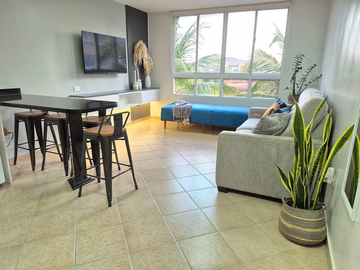 Enjoy the originality of this quiet and central accommodation with fiber optic internet and equipped with all services. Private access to the beach and beautiful social areas, spectacular pool, caney and direct contact with the sea, unbeatable location. since it is a 5-minute walk from shopping centers (Caribean mall) and important hotels such as Maremares and the golf course. This apartment is newly remodeled and equipped. It is delivered with linen, towels, water, coffee, etc.