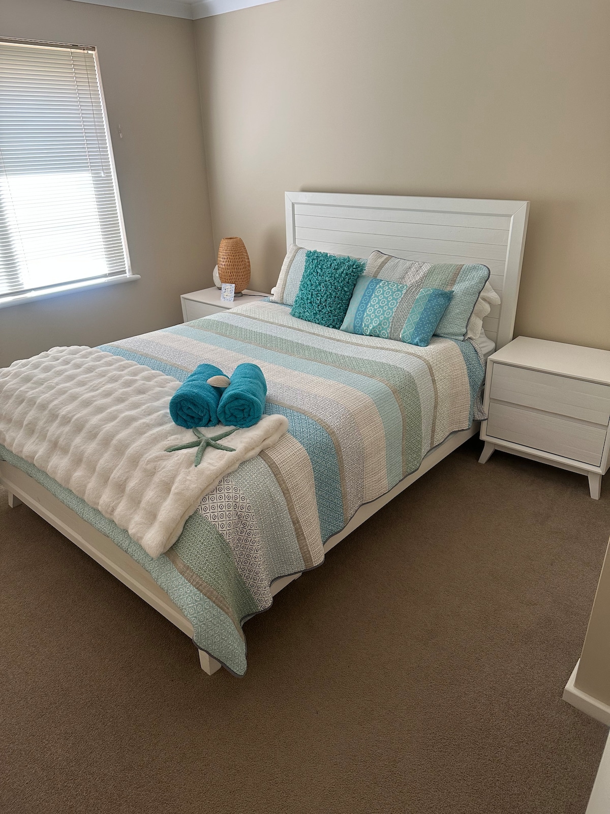 Escape to coastal charm at Blu-Zea Bungalow, a bright and breezy 2 bed 1 bath ground floor home perfect for a couple or small family (2 Adults 2 Children) just 1 hour and 10 minutes north of Perth. Set on a 1011m2 block, this comfortable home-away-from-home is the perfect base to relax, unwind, and explore Lancelin. Just 500m stroll to the beach, 300m to cafes/local shops, and a leisurely 10-minute walk (1.4km) to the pub! You’re right in the heart of it all without sacrificing privacy or peace.