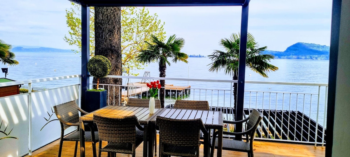 Cozy one-bedroom apartment directly on the lake, ideal for up to 4 guests. It features a double bedroom, bathroom, living room with sofa bed, a fully equipped kitchen with dishwasher, and a furnished terrace. Amenities include covered parking, heating, air conditioning, Wi-Fi, TV, and a safe. Perfect for a relaxing holiday with comfort and lake views.