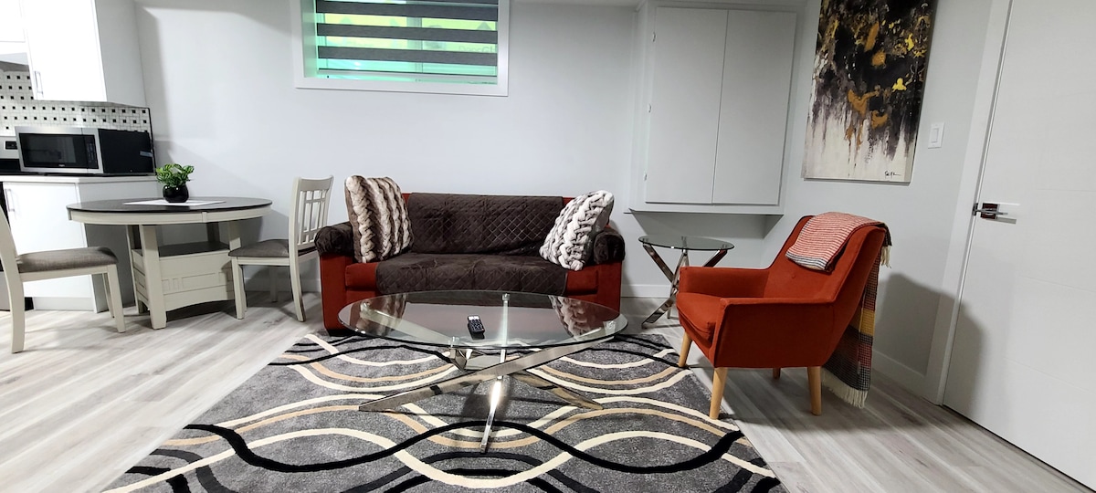 Beautiful memories await you at our brand New executive, spotless and spacious 2-bedroom legal basement suite. Here you will have 5-star sleeping experience at a 1-star price. Step into our modern private entrance basement fully equipped and tastefully furnished to meet all your needs. Our suite has soundproofing which reduces noise from the main floor, but you may still hear sounds occasionally. The bedrooms have Queen bed and Full size bed and love seat in the living room. Self check service