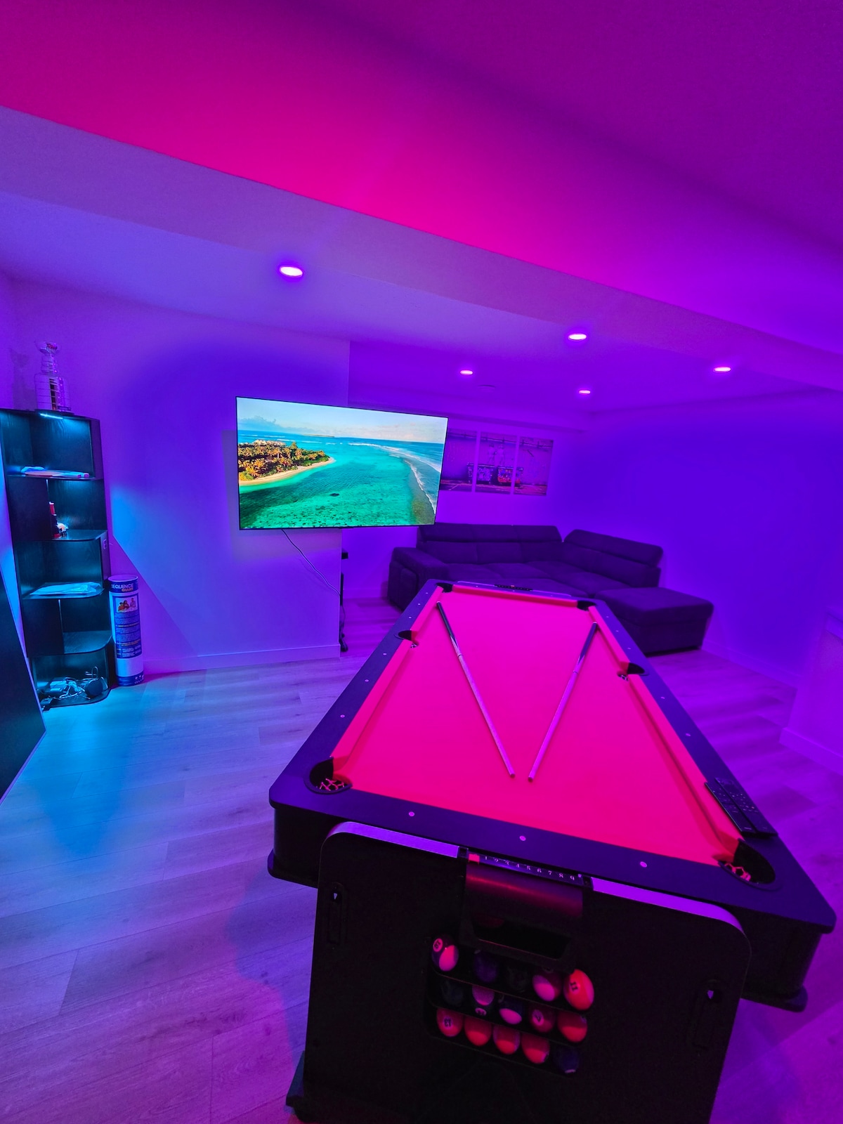 Beautiful brand new 4 bedroom , 3.5 bathroom house with fully stocked kitchen , 82" TV with sound system and massage chair in living room. Game room with pool table , ping pong, poker, large TV and sound system. Luxury hot tub, BBQ and patio furniture in beautiful backyard. This house is located 15 min from international Airport and within minutes to access Anthony Henday and only 10 min away from South common, with lots of shopping, restaurants, movie theater and entertainment.