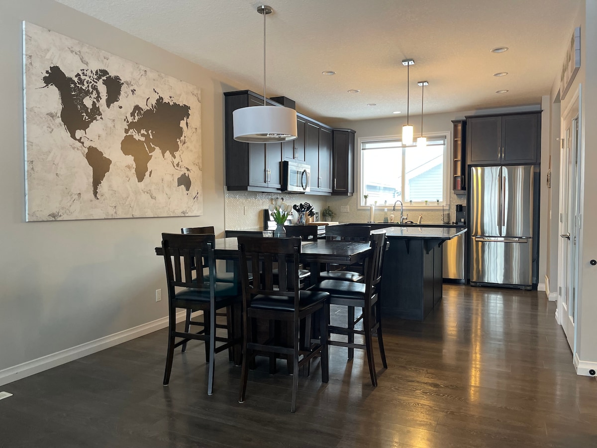 Welcome to our Summerside Home Away from Home Bring the whole family and relax in this cozy spacious two level home located in the South Edmonton Common Summerside neighborhood. Just a quick 13 min drive from the Edmonton Airport, 5 mins to South Common Shopping Center. This home has 3 spacious bedrooms 1 king bed, 2 queen beds two full baths upstairs and a half a bath on the main level. Nice equipped kitchen to cook and entertain as you bring everyone together. A Must Stay!