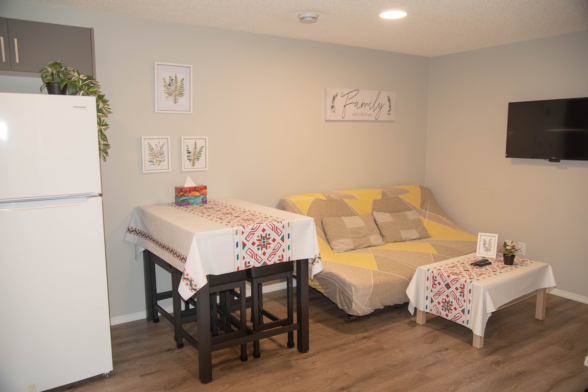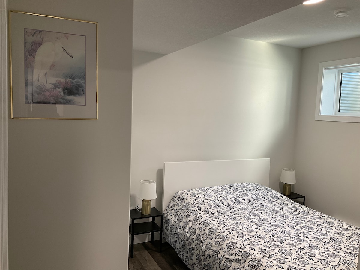 Spacious private basement suite. Stylishly decorated living room & a dedicated office space; A nice couch to sit & watch your favourite shows. Couch can be converted into a Queen bed to accommodate more guest. The bedroom features a comfortable queen mattress with extra pillows. Bassinet is available upon request. The suite is within walking distance to a playground, restaurants, grocery stores, walk-in clinic, pharmacy, bus-stop & 15mins DR to YEG. Cleaning done before guest’s arrival.