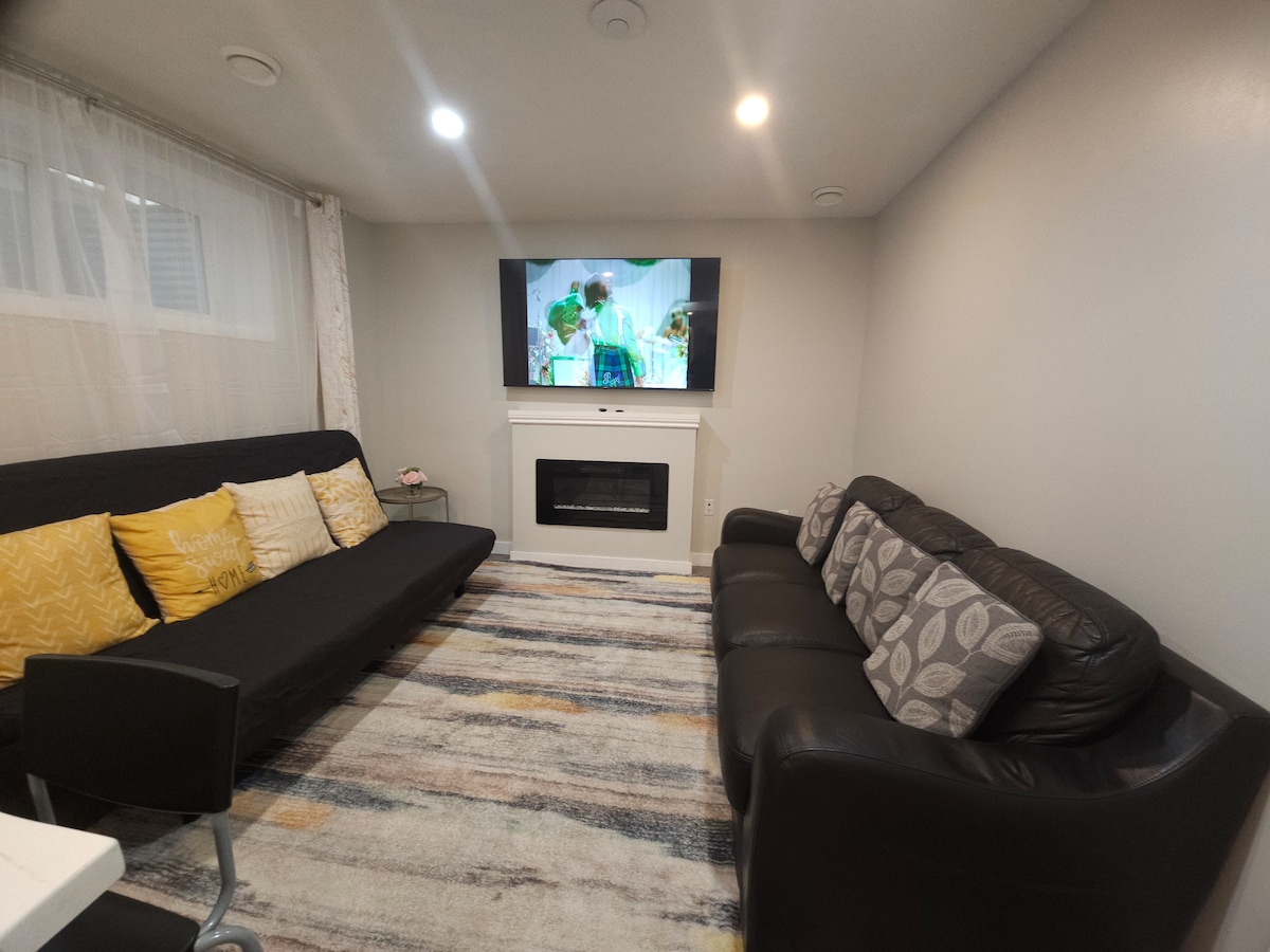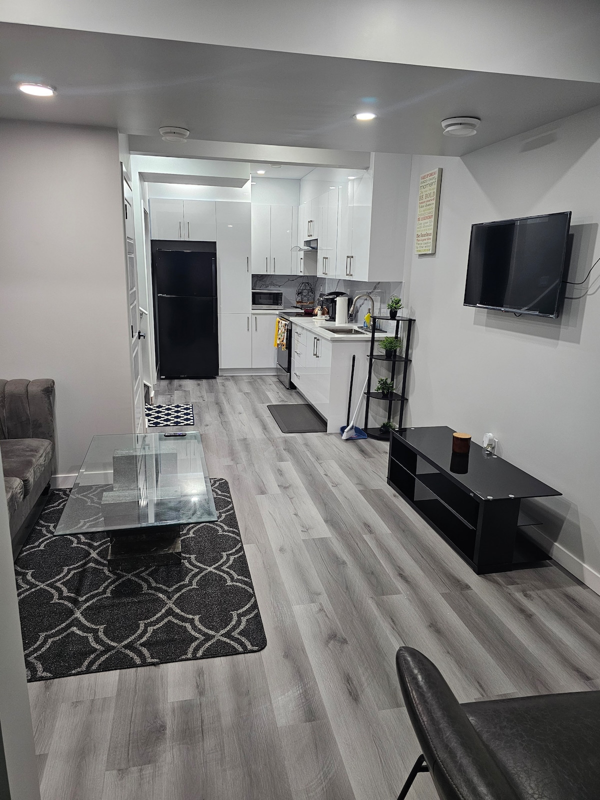 This unique place has a style of its own. With a 65 inch TV installed in the cozy living area which has a sofa bed. TV has Netflix for your entertainment, you’ll feel pampered. The large bedroom is furnished with super comfortable queen bed for your relaxation. The kitchen is well equipped with all you need to feel at home. You will come back for more of this luxury located in a quiet area and yet 300meters walk to supermarkets, dollar store, Tim hortons and restaurants. Close to the airport