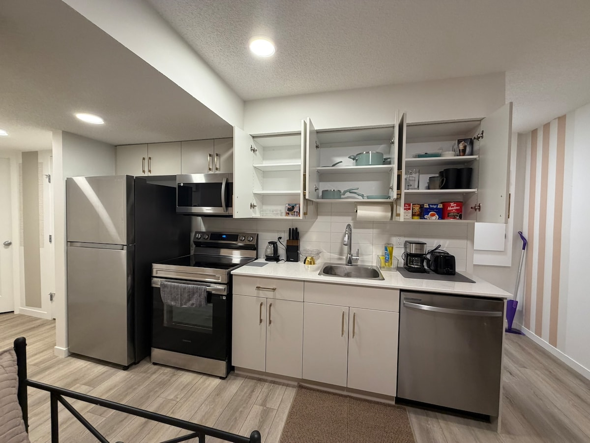 Enjoy your stay in our Luxury Modern Home in one of the best neighborhoods - Langdale! ✔ AC!!! ✔ 2 Bedrooms - Accommadate up to 5Guests ✔ Beautifully Designed brand new entire house for use! ✔ Fast WiFi - Ideal for Working Remotely! ✔ Fully Equipped & Stocked Kitchen! ✔ 60'' Smart TV ✔ In-suite Washer and Dryer! ✔ Professionally Cleaned! ✔ Ideal for Family ✔ ✔Dog friendly ✔✔3 Mins to AnthonyHenday ✔ ✔15 Mins to Airport area&DT/10 Mins to WEM/3 Mins to businessDistrict THE ONE AND THE ONLY!