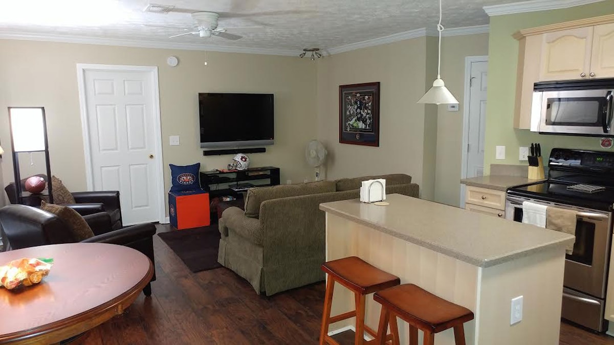 TWO BLOCKS TO TOOMER'S CORNER! Unbeatable first-floor location in downtown Auburn. Park at condo & don't worry about where to park for the game! Short walk to downtown, campus, Jordan-Hare Stadium, Neville Arena, & Plainsman Park! Enjoy being downtown - without the noise! Completely updated & fresh paint throughout entire condo. New flooring in bedrooms & bathrooms. All new furnishings & bedding. ALL bedding washed before each stay. Clean & cozy condo sleeps 6 comfortably. 2 parking passes!