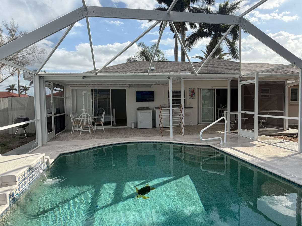 Escape to this waterfront Cape Coral retreat with Gulf access, a private pool, and spa (heated in winter). Enjoy serene canal views, a private dock, and seamless indoor-outdoor living designed for relaxation. This 3BR, 2.5-bath home features a fully equipped kitchen and comfortable, upscale spaces. Nestled in a quiet neighborhood near dining, shopping, and waterfront restaurants—perfect for a peaceful coastal getaway.