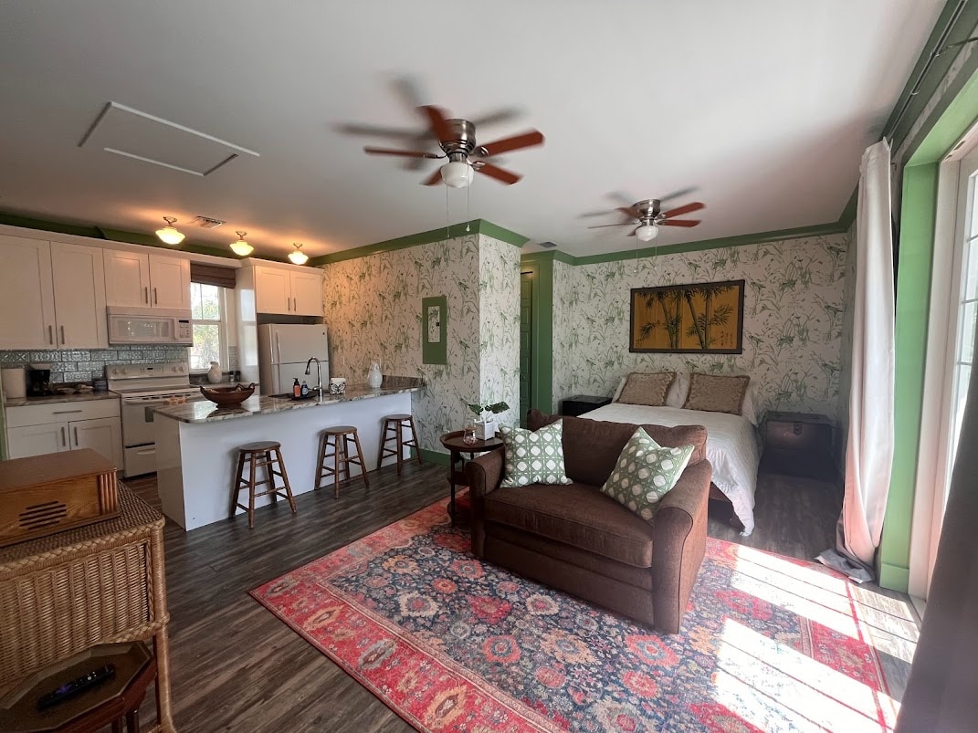 We are ready to welcome you back to to the Dean Park Historic District and our charming 1920's Colonial style guest house. We hope you will enjoy its quirky layout and park like property . This ground floor guest house apartment is equipped with a queen size bed in the bedroom, reading nook, bathroom, full kitchen, 2 smart TV's and private patio. Everything you need to enjoy a relaxing Florida lifestyle!
