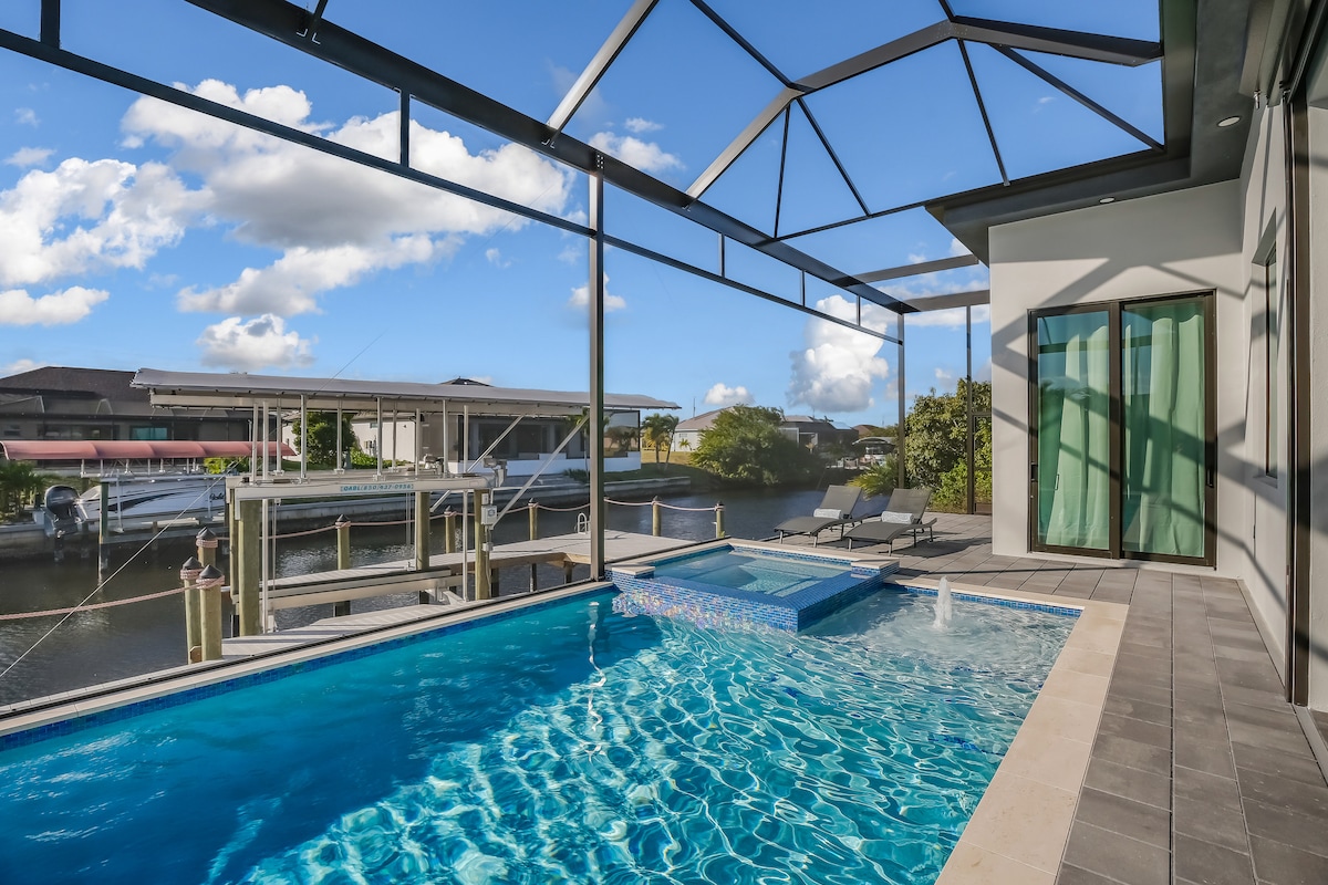 Escape to this 5-bed, 3-bath oasis in Cape Coral’s canal system, just minutes from the Gulf of Mexico by boat. Relax in the lanai-covered saltwater pool and hot tub, surrounded by tropical landscaping. Perfect for families, pets, and biz travel, the home features a spacious kitchen, multiple TVs, cable TV, and water views. Just 5 mins to beaches, 10 mins to dining & shopping, and 35 mins to Fort Myers Airport—your ultimate Florida escape awaits! Moderate cancellation policy & no cleaning fee!