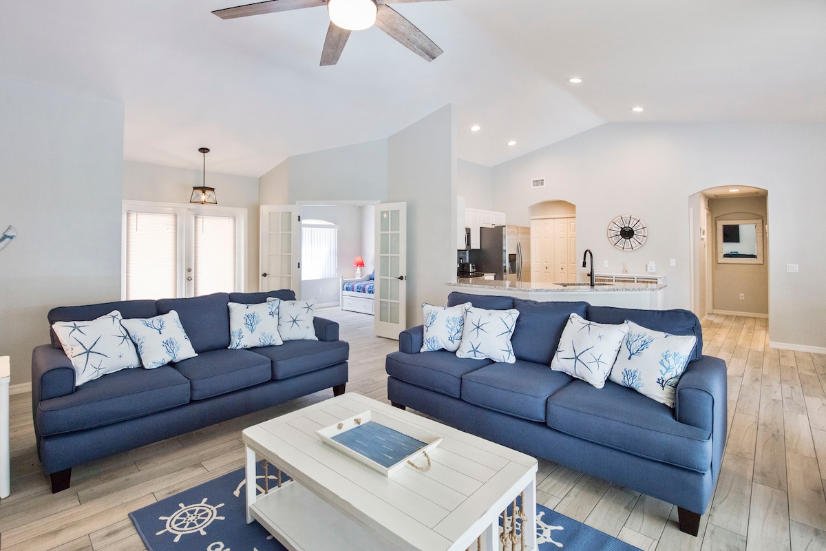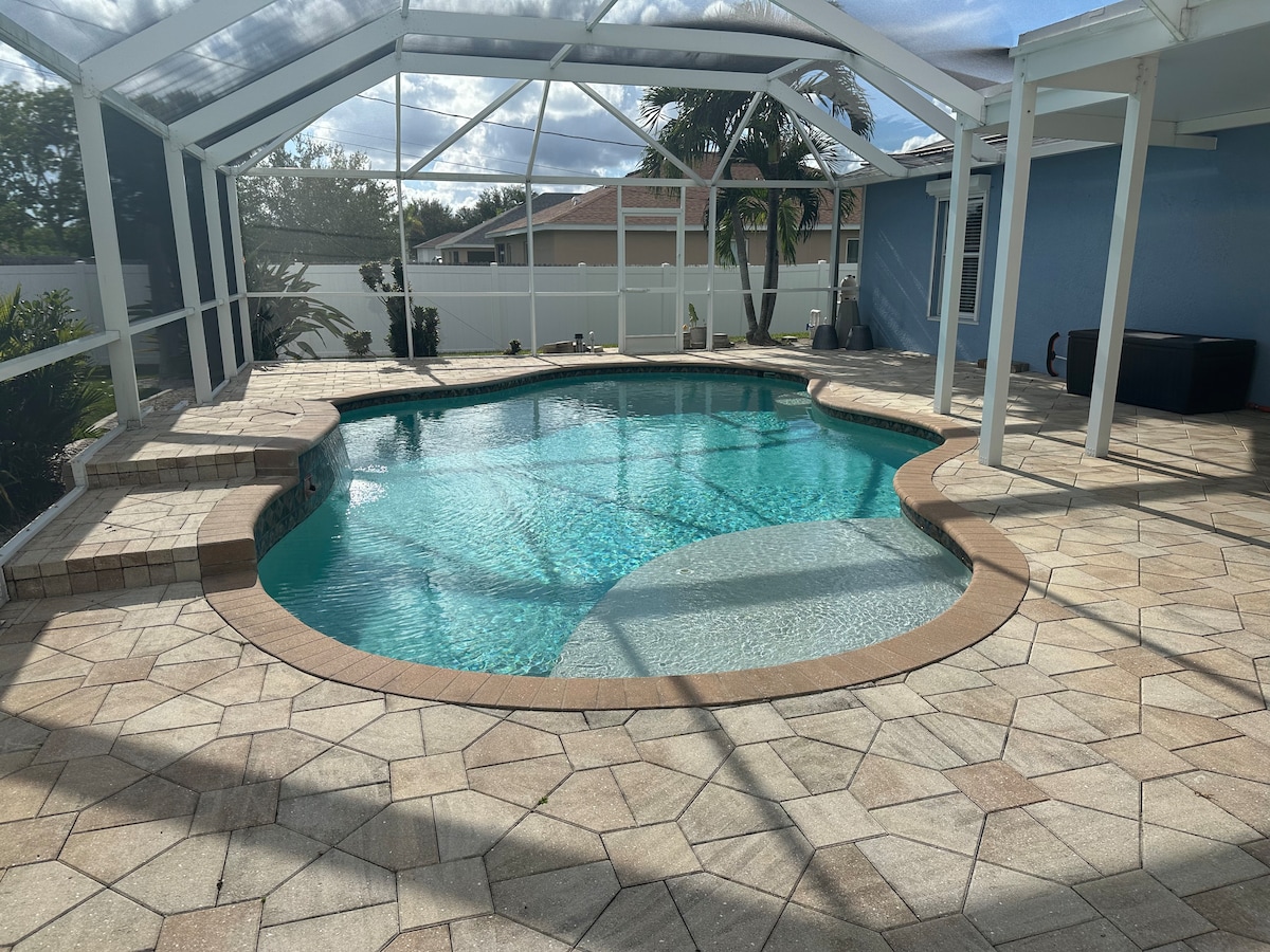 Relax at Casa Colada - a renovated 4-bed, 2.5-bath Cape Coral home, perfect for up to 8 guests. Enjoy a heated pool with a waterfall, a covered lanai with a grill, and a wet bar with a wine fridge. Each bedroom has a queen bed and the home includes a soaked tub, 5 smart TVs, high-speed internet, a laundry room, and free parking. Close to attractions like the Cape Harbour, Cape Coral Farmers Market and Four Mile Cove Preserve. No stairs. Great for families, retirees, and business travelers.