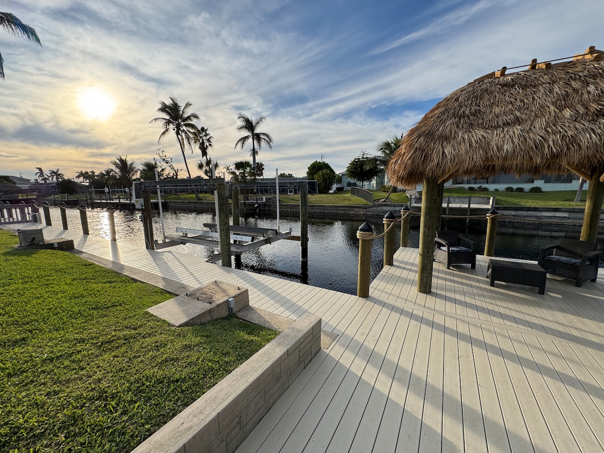Sea You at the Cape, the perfectly located SW Florida getaway. Enjoy this stunning home on a wide canal. Watch the boats go by from your saltwater infinity edged pool, hot tub, or from the newly renovated interior. This home will help you breathe easier, laugh more, relax, and rejuvenate. Then hop on the provided kayak or bicycles to explore Cape Harbor and the many restaurants, shops, bars, and activities of Cape Coral. By boat enjoy the gulf and beaches just a mere 20 minutes away. Enjoy!
