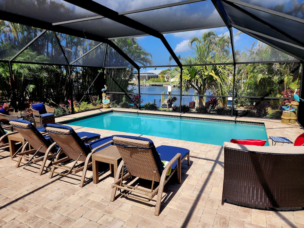 Talk about location! This house is located in southwest Cape Coral close to everything great that Cape Coral has to offer including marina, restaurants, shopping, bike trails, kayaks included etc. Right across the street from Cape Coral's most exclusive neighborhood Cape Harbour. This house has a heated pool facing west for sun all day long and fantastic sunsets, new hot tub, boat dock, and completely remodeled check out the primary bath and all brand-new furnishings including kids stuff.