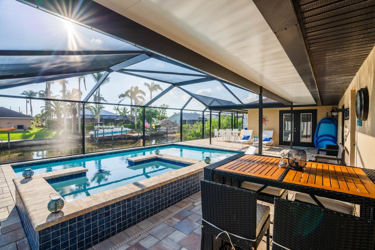 Elegant home on a wide-open canal with a dock and miles of fresh water boating is located in one of the most desired pockets of Cape Coral. Waterfront 3 bedroom, spacious living room, kitchen, breakfast bar, 2 full bathrooms, large saltwater spa, BBQ, game room. Relax in the hot tub or kayaking from the patio overlooking a beautiful canal. Enjoyment, adventure & relaxation for up to 10 guests. Premium area close to restaurants, supermarkets, beach, waterpark, golf clubs, and attractions.