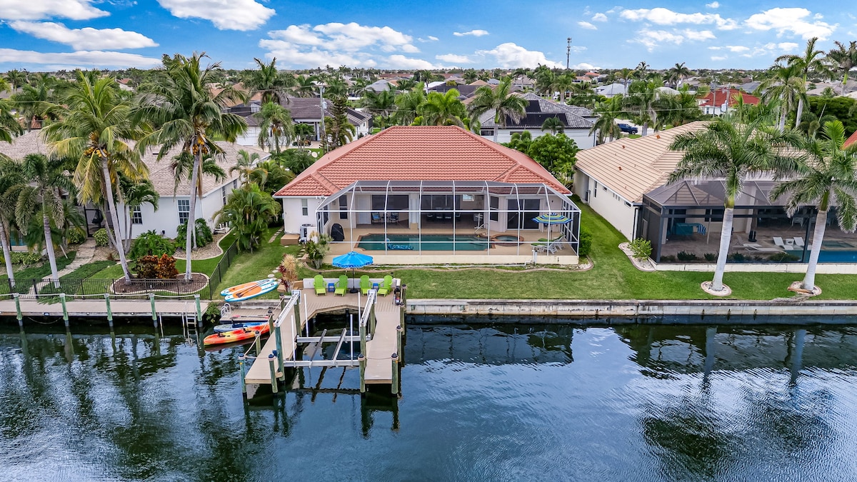 Villa Salt & Sol, an elegant, Coastal retreat in the yachting community of Cape Harbour, Cape Coral. Framed by stately royal palms - just 3 blocks from Camelot Park - Tennis/pickleball courts, playground/picnic areas, VILLA Salt & Sol blends upscale comfort w/coastal tranquility. • Gulf Access • 4 Kayaks • Dock w/13,000lb lift/Tiki Hut + glass bottom viewing area • Smart TVs in bdrms/2 liv rms/pool area • Beach/Fish Gear • Dog OK • Fenced yard • Free HTD Pool • Adults/Kids Bikes • Baby Gear