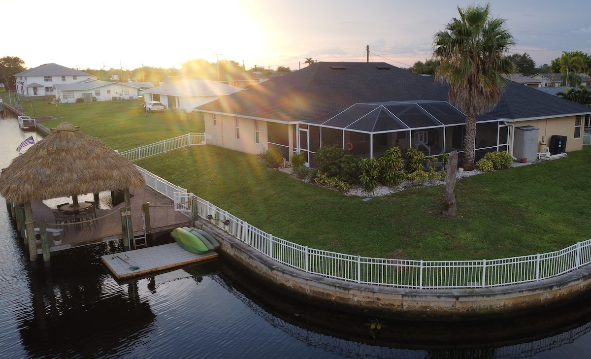 Our beloved Cape Escape House awaits for your family vacation in South Florida! Heated, screen-enclosed pool, huge corner lot waterfront fenced in, outdoor kitchen, Kayaks, Tiki Hut, and outdoor lana. Centrally located between Ft. Myers and miles of island beaches, two marinas, a downtown, and lots of great food & drinks. 4 bedrooms offer a King, 2 Queens, and 2 Twin beds, plus a den with two sofa sleepers and 2 full bathrooms! Two bedrooms allow for patio doors to pool.