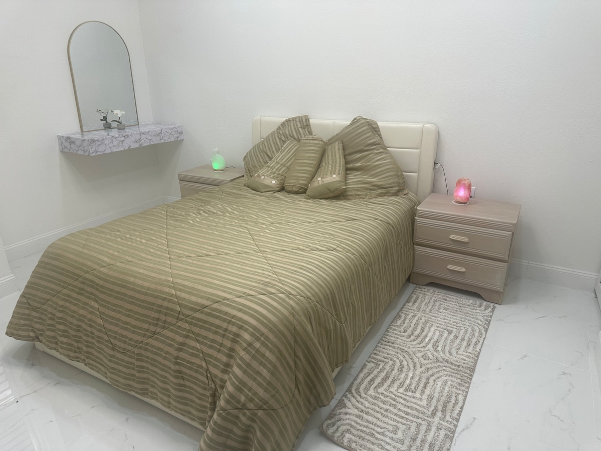 This NON-SMOKERS effenciency apartment has a comfy firm King mattress with a foam topper. Melt your stress away as you sleep PLEASE NOTE: The Apartments laundry is done on a weekly basis… but personal laundry can be done in a local Laundromat. A small kitchen area (NO STOVE) private entrance in a quiet ,safe neighborhood.Close to shopping and hospitals and other Florida The Air is set at 77*