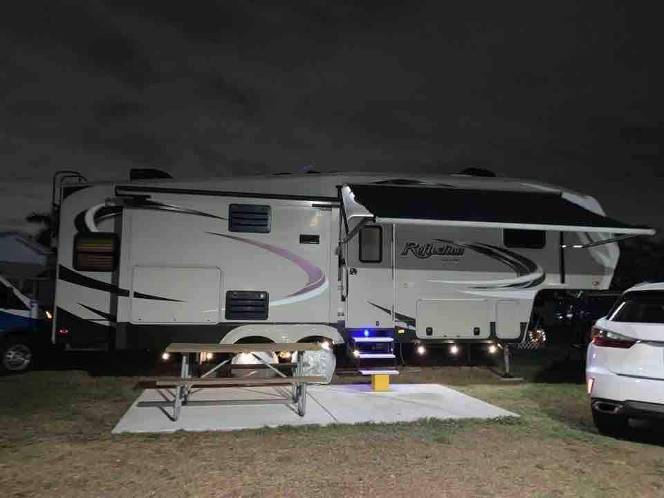 Luxury camper at Fort Myers Beach RV Resort. Also close to Sanibel/Captiva Islands, shopping, restaurants, arcade and go-cart track. Sleeps up to 4. 1 bedroom with queen bed, pull-out couch in living room and double recliners. 3 slide-outs Full kitchen inside and minibar with TV on outside, as well as 2 indoor TV’s equipped with Roku devices. Camp near the beach with style!